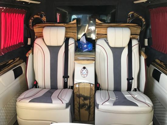 内饰科技感十足,座椅采用4+2隐藏六座设计,在车身长度5370mm的基础上更充分利用车内空间,在32寸电视周围用黄花梨木进行装饰,第二排座椅采用的是GL450反向座椅,可语音控制电动调节。