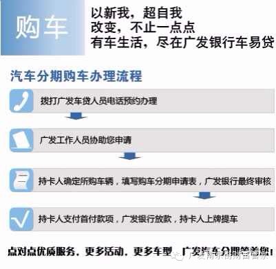 免抵押免担保 轻松购车 “车易贷”是根据广发银行信用卡持卡人的资信状况给予专属购车额度,以满足持卡人在指定经销商分期购买指定品牌汽车的需求,持卡人只需承担一定手续费即可按月分期偿还购车款项,充分减轻还款压力的一种新型分期模式。 品牌支持↓↓↓↓↓↓↓↓↓↓↓↓↓↓↓↓ 超快申请流程: 手续轻便,现场申请管理,享受广发一站式办事 超长还款期: 最长36个月分期付款,轻松成为有车一族 超低首付: 购车首付低至2成,低落持卡人首付比例 超高额度: 购车分期额度高至50万元 (严禁盗版,未经授权、克制转载!接待转发,谢谢!!)